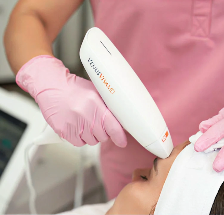 Venus Viva™ MD is a fractional radiofrequency (RF) resurfacing technology that uses NanoFractional RF™ energy delivered through very small electrodes (pins) to create microthermal zones in the skin. These controlled micro-wounds stimulate the body’s natural healing process, prompting new collagen and elastin formation, while preserving surrounding healthy tissue.